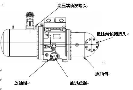 2.壓縮機(jī)的潤滑油,從油過濾器上的放油閥處放出,潤滑油接近放完時(shí),從壓縮機(jī)的高壓端偵測(cè)接頭處,注入一定壓力的氮?dú)猓?/span>1.0MPa左右),用壓力加快潤滑油排出,停止注入氮?dú)猓P(guān)閉放油閥。然后將壓縮機(jī)的油過濾器拆卸下來,將油槽里的潤滑油全部放出來,再將油過濾器清洗后裝上緊固。如圖所示: